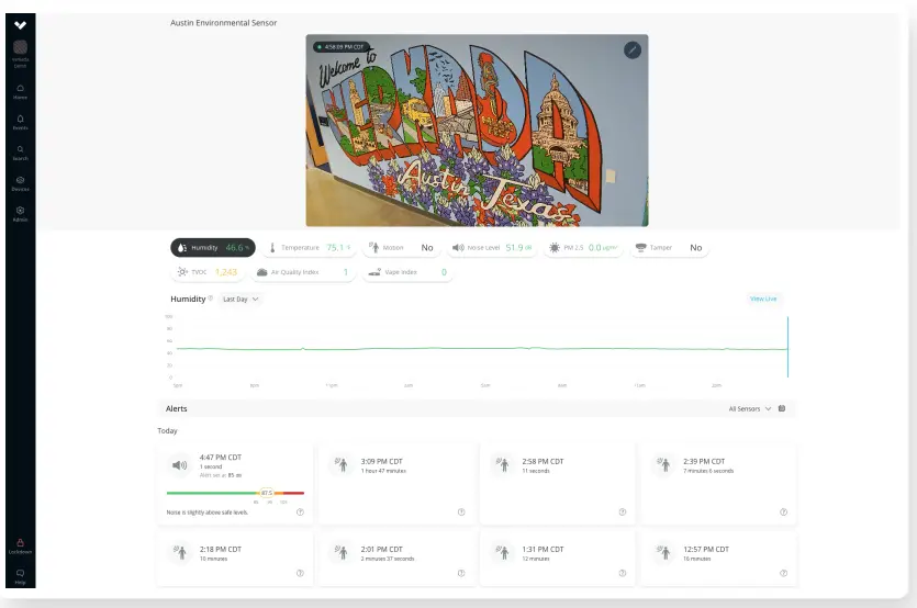 For this reason, the Vape Index should only be enabled in areas more prone to vaping (restrooms, classrooms, hallways, hotel rooms) and not in spaces where common events could cause a false positive (kitchens, manufacturing floors). Additionally, users are encouraged to link a camera with each sensor, providing visibility and context into events taking place to investigate what triggered an increase in the Vape Index reading.