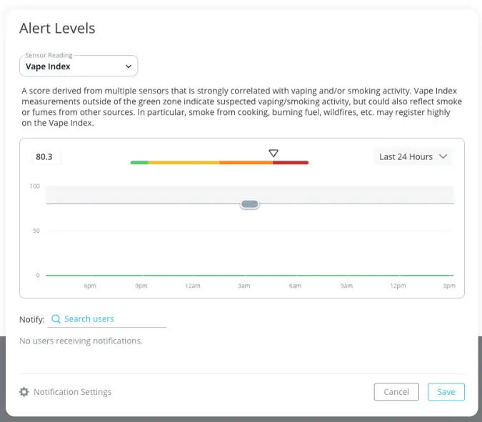 After clicking on a site from the main Sensor page, select the Vape Index button across the top. Then click the red rectangle that says “Alert set at” or “Set alert”. From there, users can customize the threshold at which they want to receive an alert. Users can choose any number from 1-100 on the Vape Index Scale.