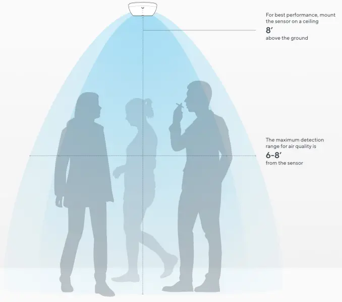 For detecting vaping and smoking events, it is recommended to have the SV11 mounted from the ceiling directly above the area where smoking is likely to occur. For best results, the SV11 should be placed 8 feet from the ground.