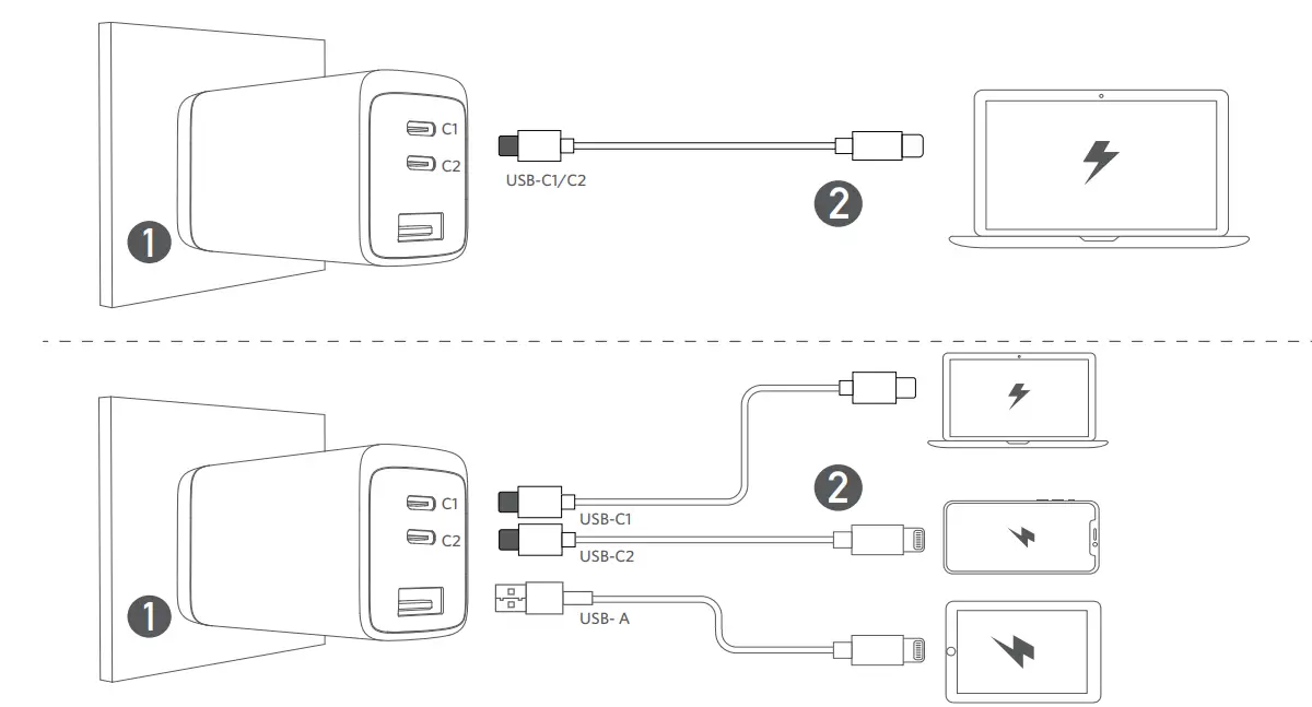 | Output | Use One Port Use 1 Port Output USB-C1(Top Port) , USB-C2(Middle Port) USB-C1/USB-C2 : 5V ⎓ 3A /9V ⎓ 3A /15V ⎓ 3A /20V ⎓ 3.25A (65W Max) USB-A : 4.5V ⎓ 5A/5V ⎓ 4.5A /5V ⎓ 3A /9V ⎓ 2A/ 12V ⎓ 1.5A(22.5W Max)Use Two Ports USB-C1+USB-C2 : 65W Max USB-C1+USB-A :65W Max USB-C2+USB-A: 24W Max Use Three Ports |
