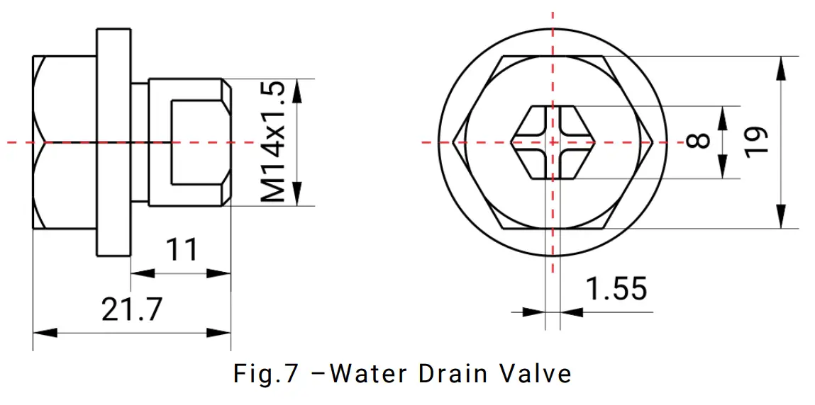 Drain valve: Can be opened or closed using hexagonal wrench, adjustable wrench, or a crossscrewdriver.