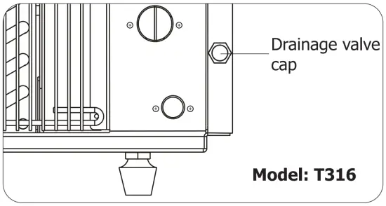 - Unscrew the drainage valve cap at the right lower part at the rear. Let the water drain from the water reservoir thoroughly. Afterwards, re-locate the drainage cap and screw tight.