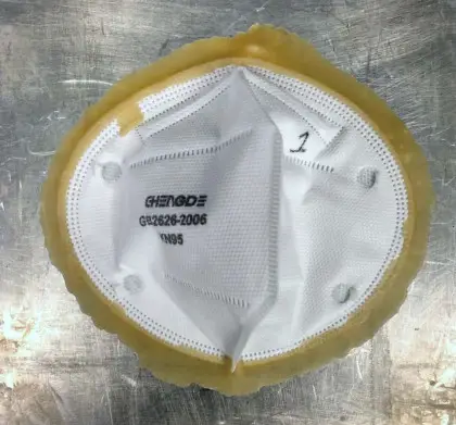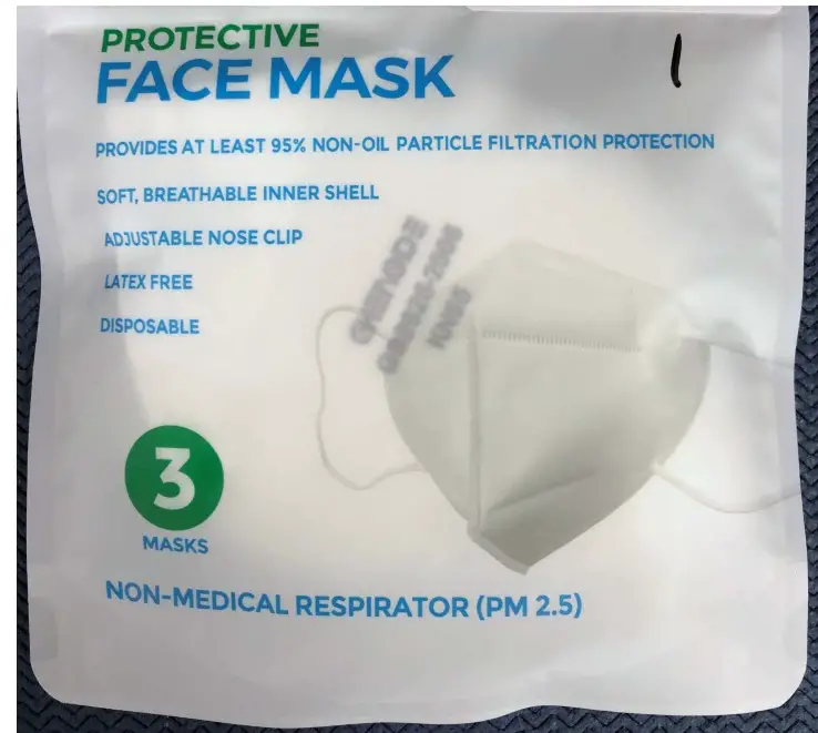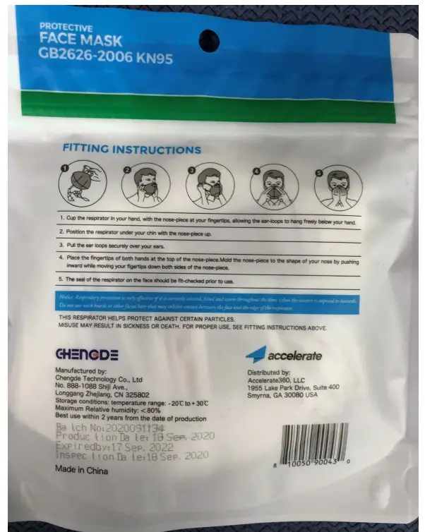 These findings pertain to the Chengde Technology Co., Ltd., model KN95 Folding Protective Mask. The packaging and labeling for this product indicate that it meets GB2626-2006 (the Chinese standard for Respiratory Protective Equipment — Non-Powered Air-Purifying Particle Respirator).