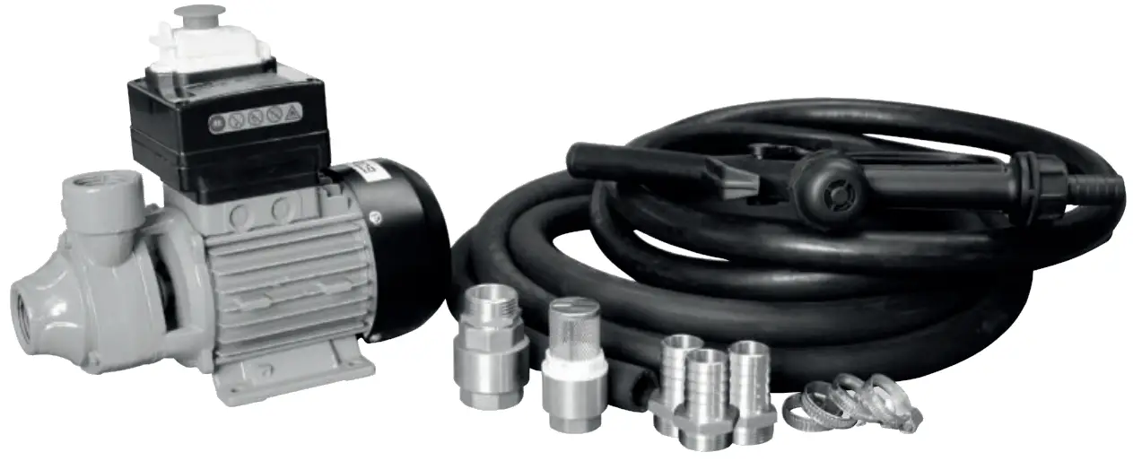 Strong pump for pumping heating oil and oil. Complete with 2 m suction hose, 4 m pressure hose, undervoltage release with emergency switching off, pvc pump nozzle, brass foot valve and brass lifting valve.