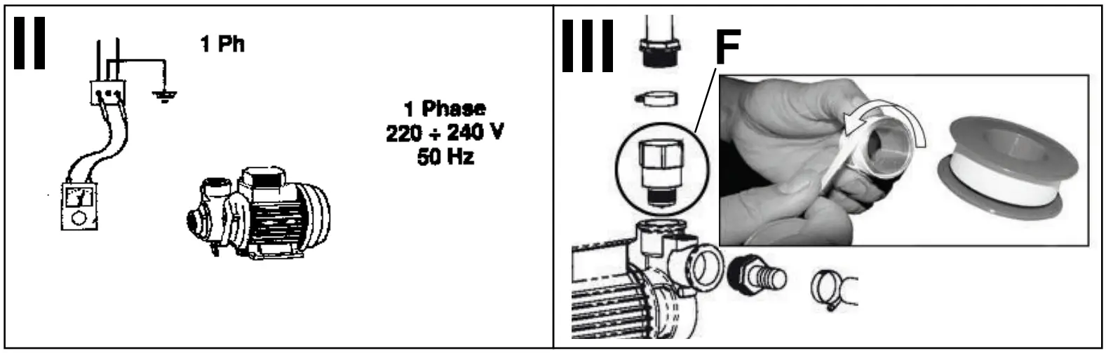 First tighten the thread at the end of suction hose with tephlone strip, preferentially with hemp, and screw the foot valve into the sealed thread of the suction hose (Fig. I/c).
