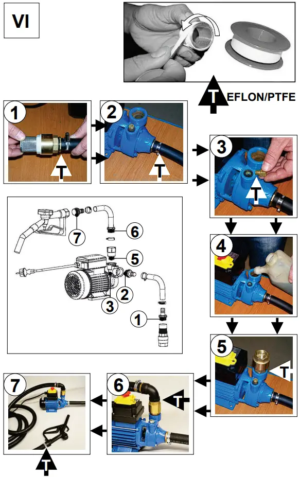 Seal the end of the pumping gun (Fig. I/b), to which the pressure hose will be connected, with tephlone strip, preferentially with hemp, and connect the pressure hose with pumping gun (Fig. VI/7).