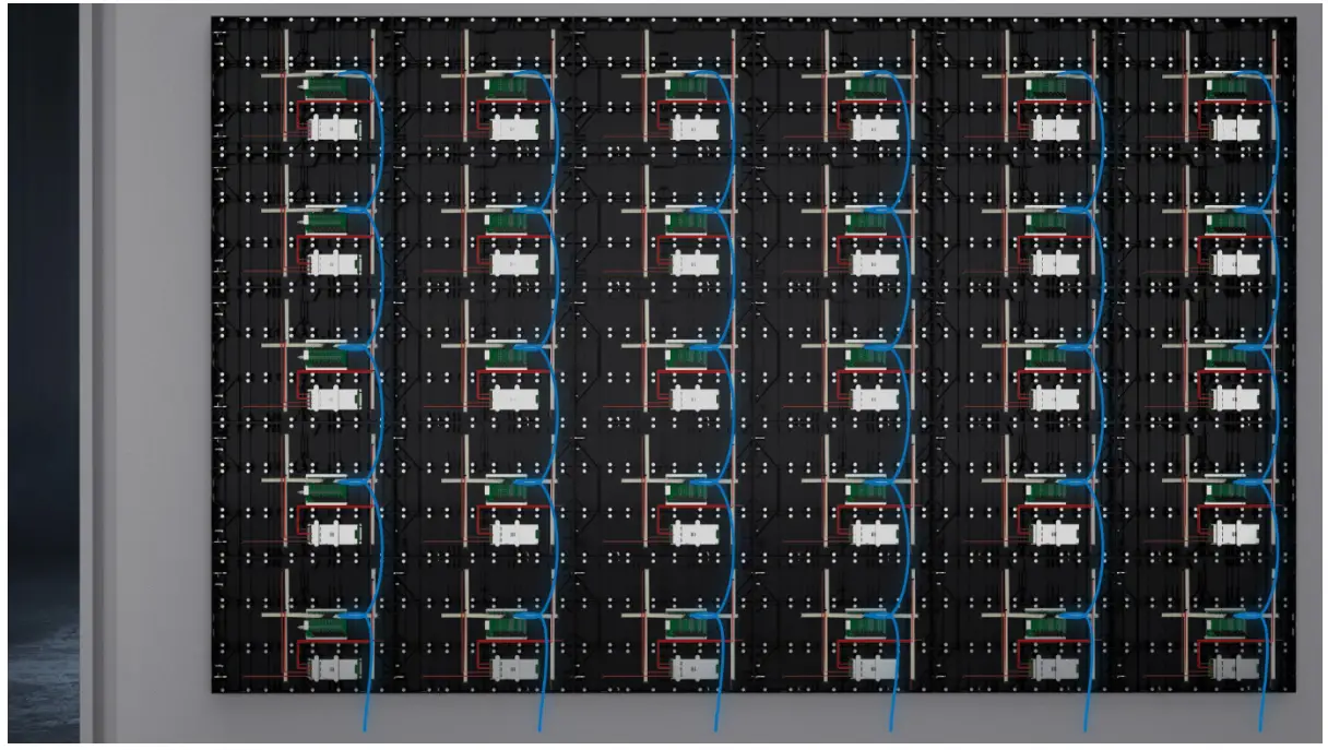Attach the magnetic screws to the modules. For each module, there should be 8 screws attached along the top and bottom as in the diagram below. Now attach the modules to the cabinets, for each module, you need to connect a power cable and data cable,