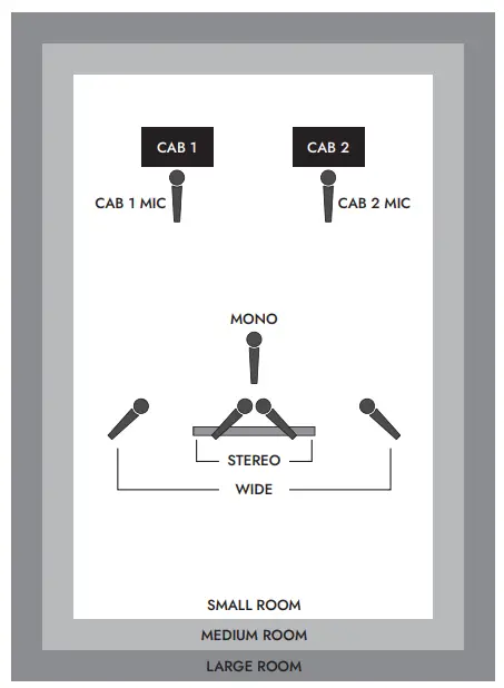 Adjust the stereo width of your room choice using this drop-down. These are emulations of three different micing techniques (shown below): mono mic, XY pair and spaced pair.