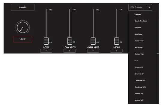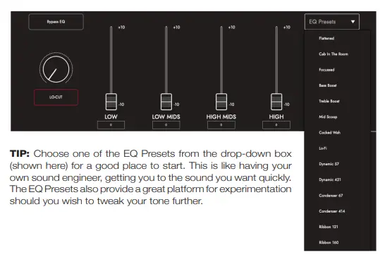 TIP: Choose one of the EQ Presets from the drop-down box (shown below) for a good place to start. This is like having your own sound engineer, getting you to the sound you want quickly. The EQ Presets also provide a great platform for experimentation should you wish to tweak your tone further.