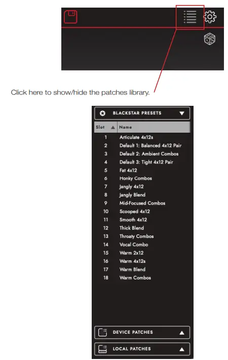 TIP: To organise your “Local Patches” in the patch panel go to “Documents – Blackstar – Saved Patches” and create your own folders. Simply drag your patches into the folders you have created and your folders will appear in the patch panel.