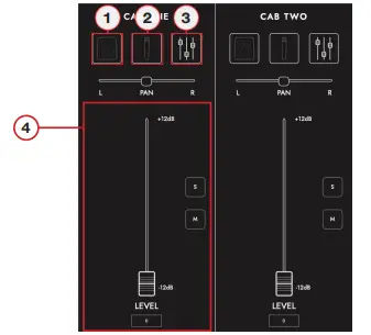 Continuously pan each of your cab and mic selections individually with the PAN slider and balance the levels of your cabs using the channel faders. Use the solo button to isolate one of your cabs, or the mute button to silence it.