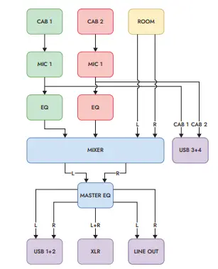 NOTE: The XLR output is a summed mono mix of the main stereo CabRig output. CabRig is derived from post-power amp and so the Master control will affect the signal level sent from this output.