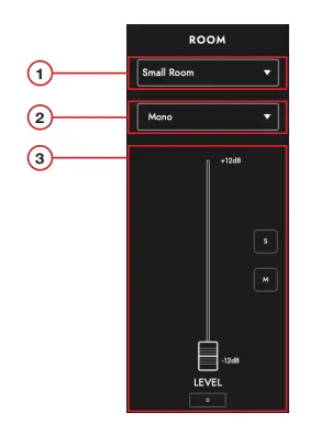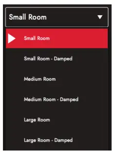 Support your cab and mic selection with room ambience. Select the type of room using the drop-down menu. Each room type has a “Damped” option; selecting this will result in a shorter and more refined sound