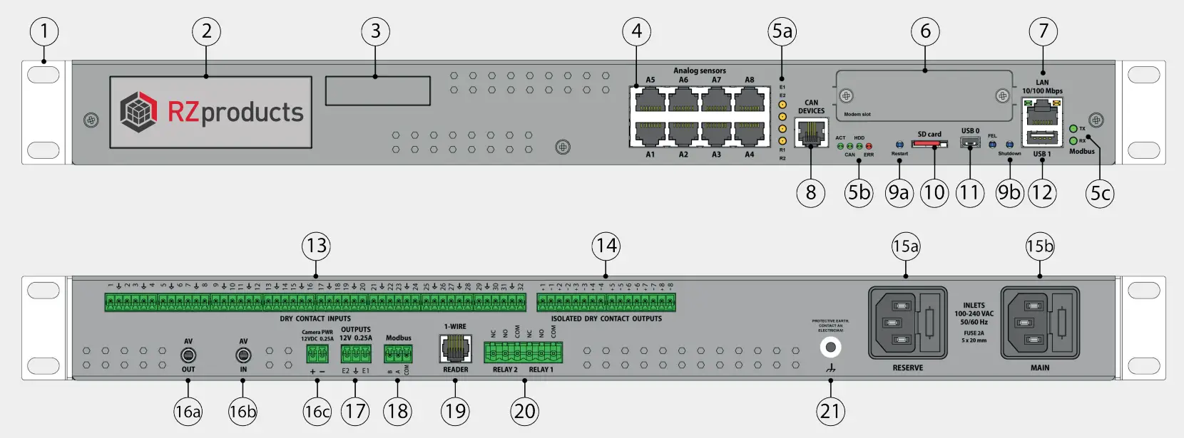 15a. “RESERVE”- Reserve power inlet. 100-240VAC, 50/60Hz, Fuse 2A, Fuse 5x20mm, type C14.