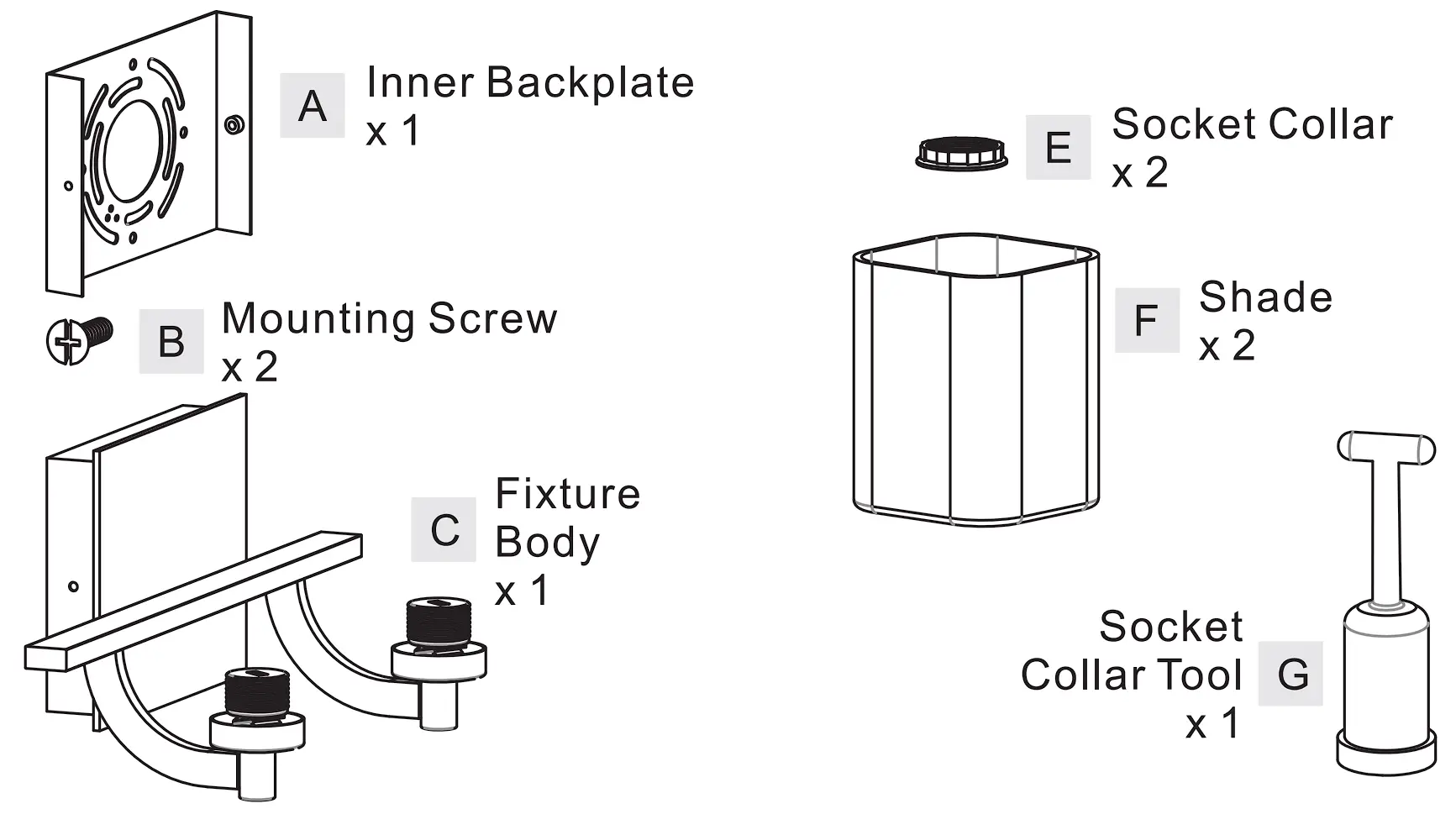 Preparation: Identify and inspect all parts before beginning installation. Check package content list and diagrams below to be sure all parts are present. If any parts are missing or damaged, do not attempt to assemble, install, or operate the fixture. Contact customer service for replacement parts.