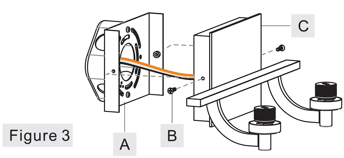 (A). Line up holes on the side of the backplate and the mounting holes on the side of the Inner Backplate (A). Secure them together by threading Mounting Screws (B) into the mounting holes on the Inner Backplate (A). Hand tighten until snug.