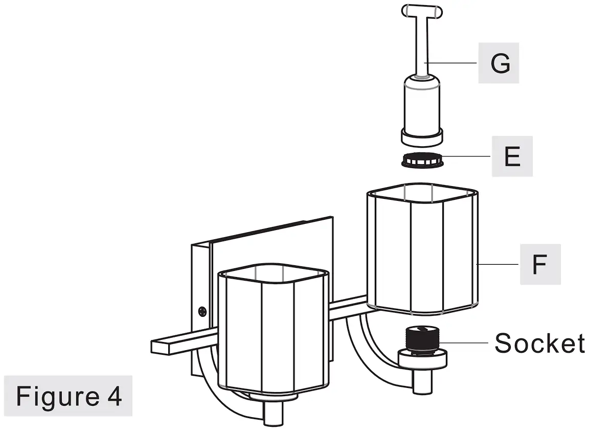 A. Place Shades (F) over Sockets as shown. By using the Socket Collar Tool (G), thread Socket Collars (E) onto sockets to secure Shades (F). Hand tighten until snug.