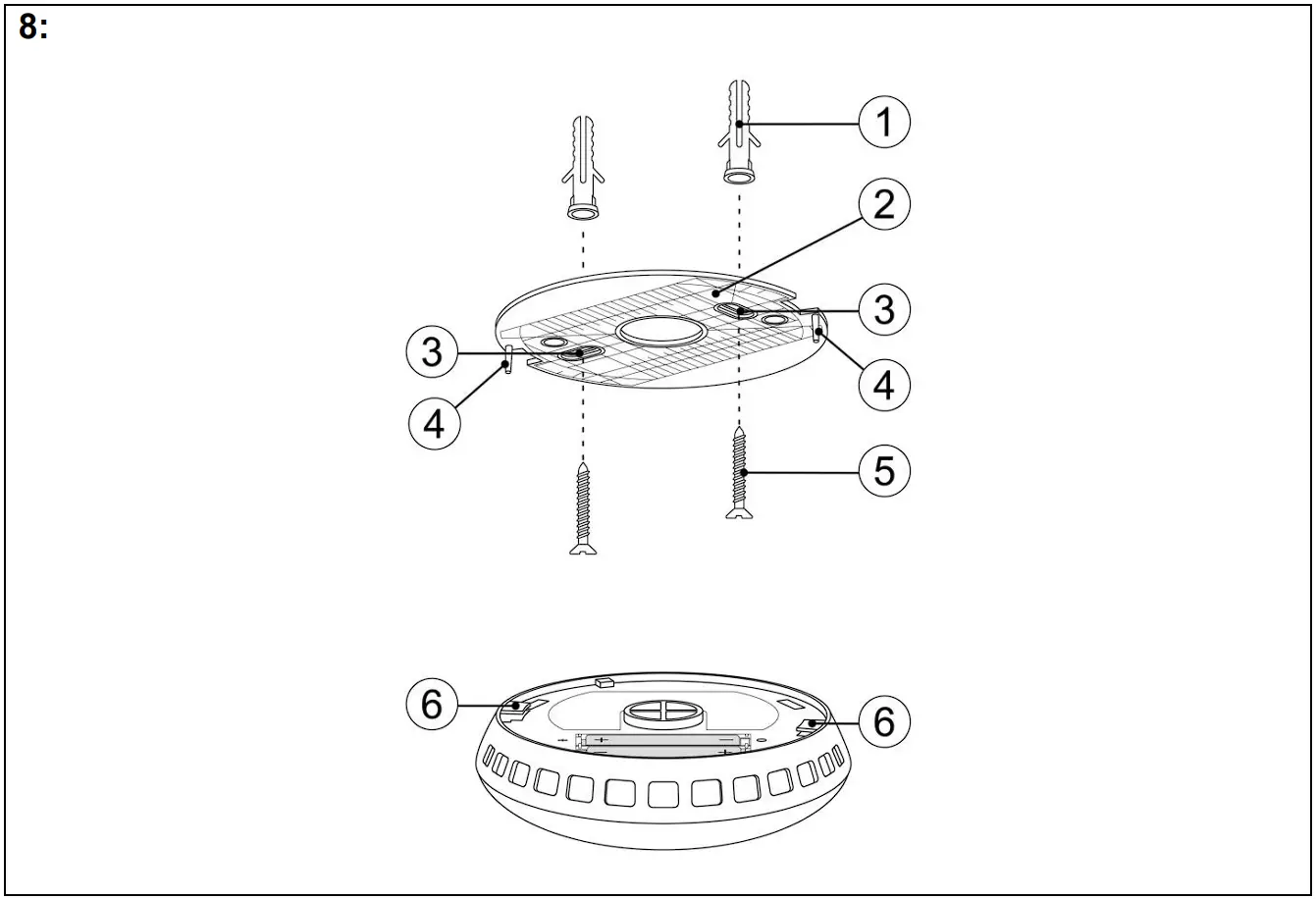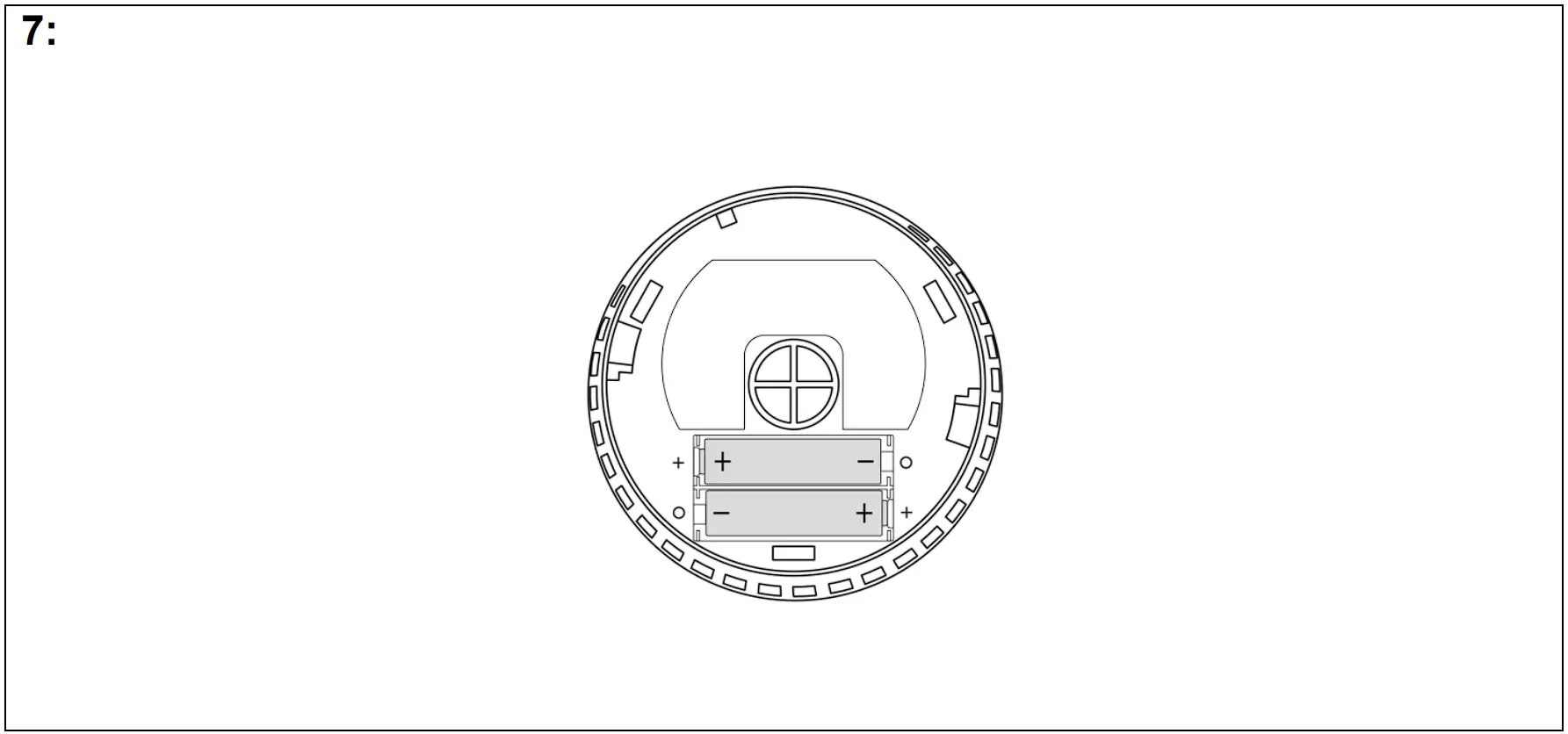 Note: The mounting plate can only be screwed to the housing when the battery is inserted. This is to prevent the smoke detector from being mounted without the batteries and thus not being able to function. - Perform a function test after each replacement or new use of the batteries (see chapter “Start up”)!