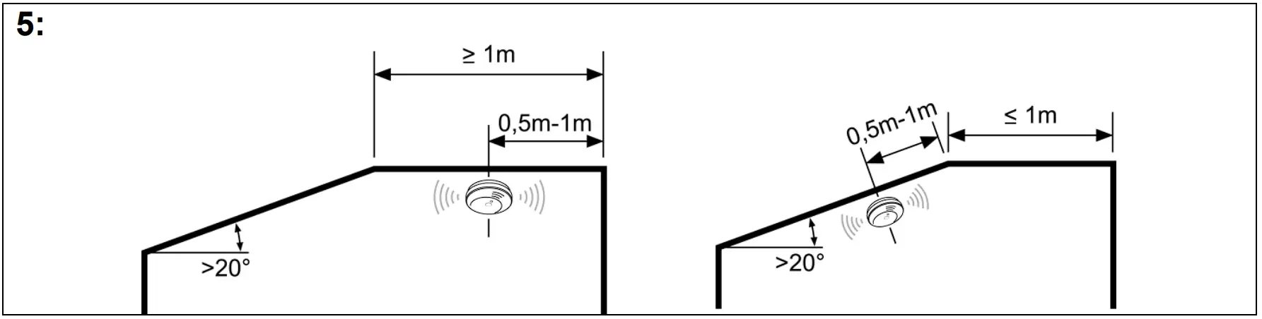 - On A-shaped roofs, the smoke detector must not be mounted at the highest point.