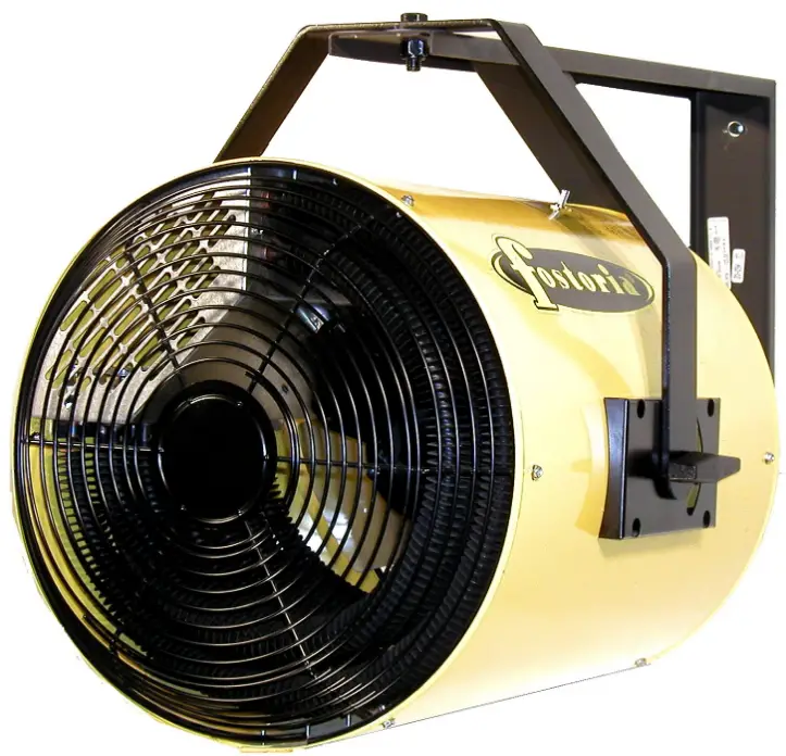 Fostoria portable and suspended electric heaters provide clean, quiet, odor-free, fan-forced heat. They are designed to circulate room air continuously; gradually heating a confined space. The best results will be obtained when using these heaters in smaller, insulated spaces. Features include a safety-yellow enclosure with front and rear safety screens; reliable stainless steel finned heating elements; a high-limit temperature switch with automatic reset; an automatic thermostat control with fan-only option; and a long-life motor and fan assembly with sealed bearings. The portable (FES) models come mounted on a two-wheeled cart with wheels designed to be easily pushed or pulled over uneven surfaces.