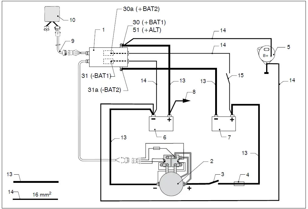 If an isolating switch (# 15) is fitted in the charging wire the battery sets can be separated if charging is not carried out for a long time in order to prevent excessive discharging.