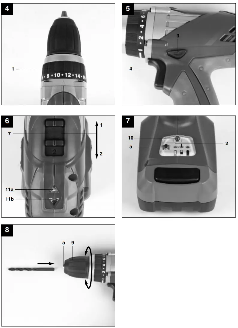 - Open the chuck (9). The chuck opening (a) must be large enough to hold the tool (drill bit or screwdriver bit).