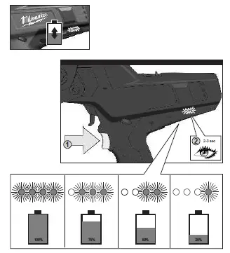 In extremely high torque, binding, stalling and short circuit situations that cause high current draw, the tool will vibrate for about 5 seconds, the fuel gauge will fl ash,and then the tool will turn OFF. To reset, release the trigger.
