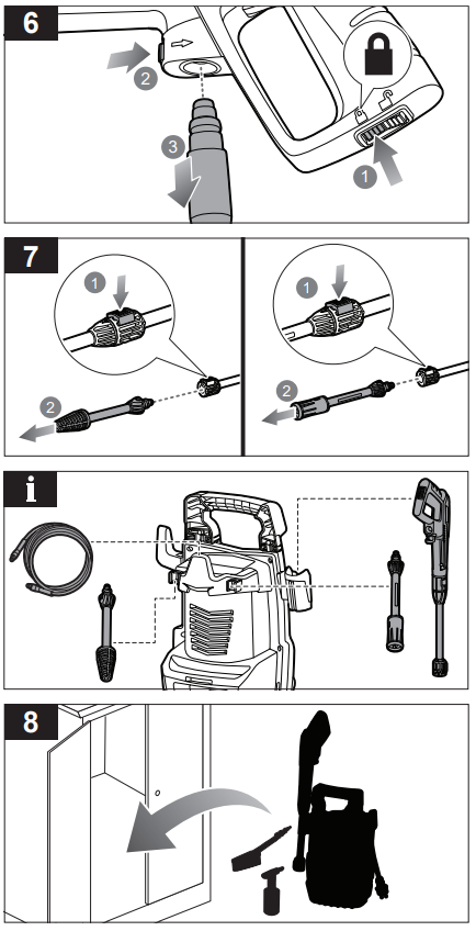 - Remove water from all hoses and the pump, and empty the detergent tank before storing the product.