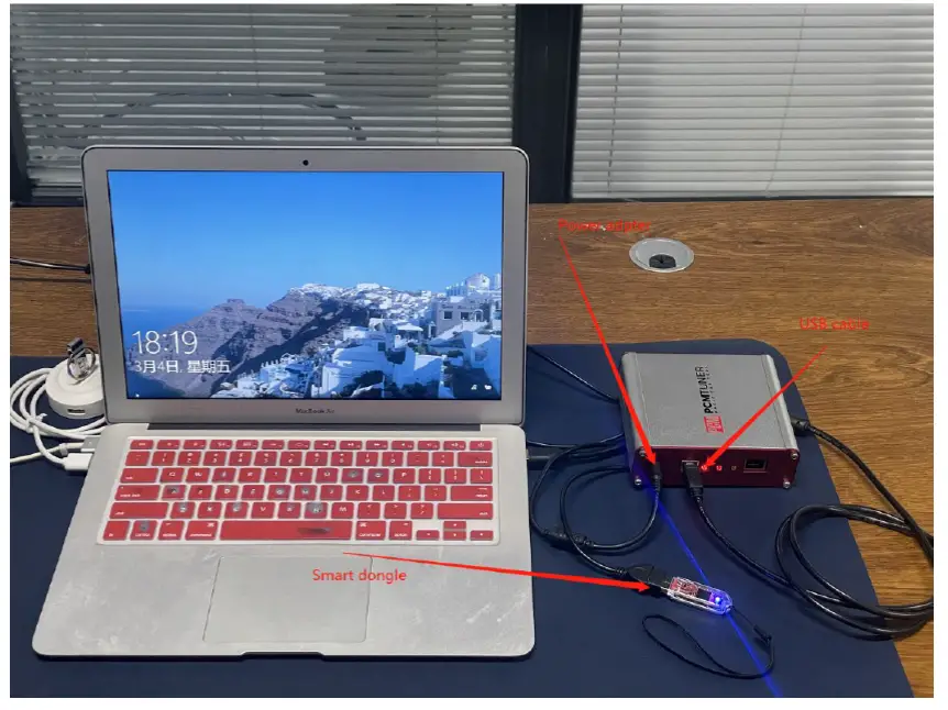 - Connect the device to the computer with power cable and USB cable, and plug the smart lock dongle into computer,like what I show you here .