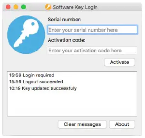 - The Software key window will appear. Type the Serial number of your key and the Activation code in the respective fields and click Activate. The window will automatically close.