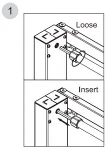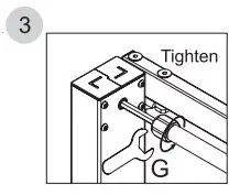 Loosen the four set screws on the telescopic crossbar (4) using the 4mm Allen wrench and adjust the crossbar length to suit the desktop. Attach the telescopic crossbar to the legs as shown using M8x50mm bolts (B), and tighten with the 5mm Allen wrench. Retighten all screws.