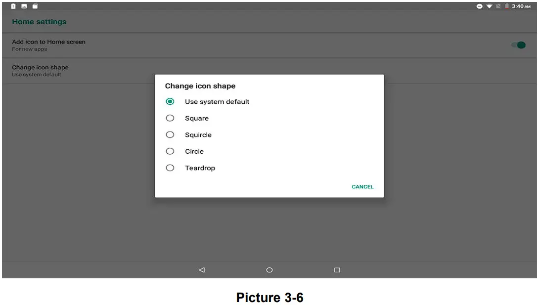 - Long press to enter the home screen settings, as Picture, you can set different application icon shapes, such as squaresquircle、circle、teardrop as Picture;