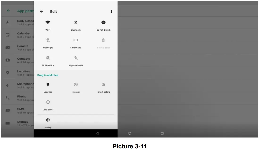 Swipe-down gesture from the top of the screen, there are nine shortcuts icons, such as Wi-Fi, Bluetooth, Auto-rotate, and so on. In the full Quick Settings list you can also tap the edit button at the bottom right to rearrange the tiles or replace them with others, as Picture 3-11. The optional extras list is pretty minimal: Just Hotspot, Data saver and Invert colors. But developers are now able to create custom Quick Settings tiles for their apps, which will definitely make things a lot more interesting in the coming mouths.