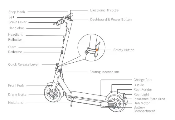Power Button: Press the button to turn the KickScooter on; press and hold the button for 3 seconds to turn the KickScooter off. When the KickScooter is on, press the button to turn the headlight and rear light on/off; press twice to switch between speed modes.