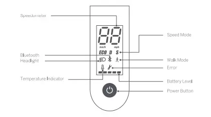 Speedometer: Display the current speed of the KickScooter, as well as to display error codes. Speed Mode: “ECO” for Energy saving mode (smooth acceleration, suitable for beginners).