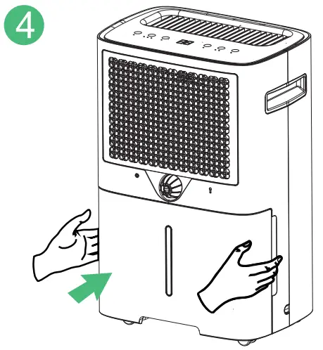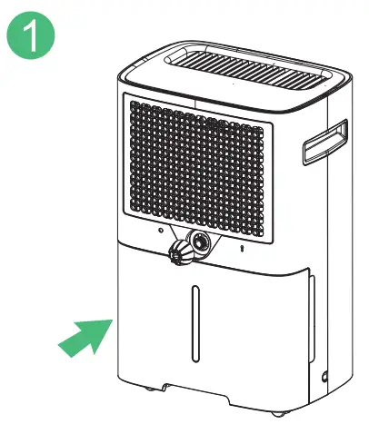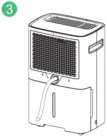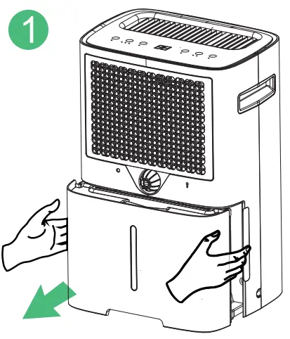 Manual Drainage: When the water tank is full, the “Full Tank” indicator will light up, and the dehumidifier will automatically switch off and will start to turn on automatically when the tank is emptied and placed back in the unit.