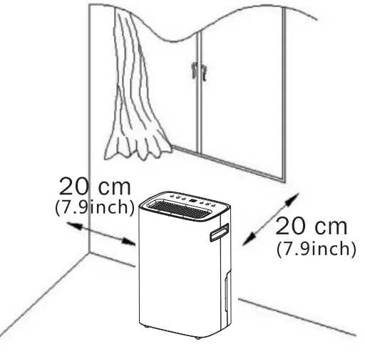 - When using a dehumidifier, other objects surrounding the machine need to be kept at at least a distance of 7.9 inches (20cm) as shown in the picture on the right: