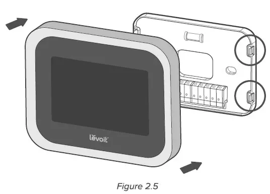 Make sure all wiring is pushed inside the wall. Carefully press the thermostat into the backplate until it clicks securely into place. [Figure 2.5]