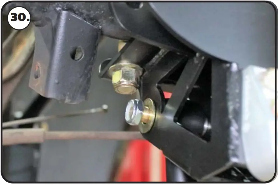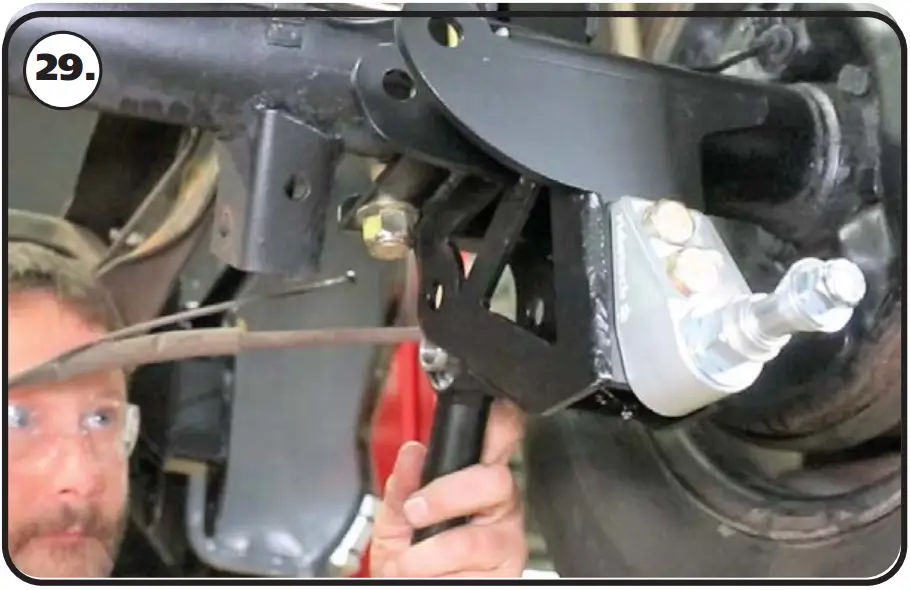 Insert the rear upper bar R-Joint into the upward axle mount. Line the through hole of the R-Joint with the of holes of the upper axle mount. Install a 5/8” flat washer on to a 5/8”- 18 x 3 1/4” hex bolt, insert into the lined up holes. Install a 5/8” flat washer followed by a 5/8”-18 THIN nylok nut. Repeat on both sides and tighten the bolts/nuts enough to eliminate any gaps.