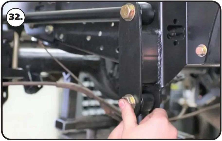- Line the through hole of the R-Joint with the of holes of the front frame mount. Install a 5/8” flat washer on to a 5/8”-18 x 3 1/2” hex bolt, insert into the lined up holes. Install a 5/8” flat washer followed by a 5/8”-18 nylok nut. Repeat on both sides and tighten the bolts/nuts enough to eliminate any gaps.