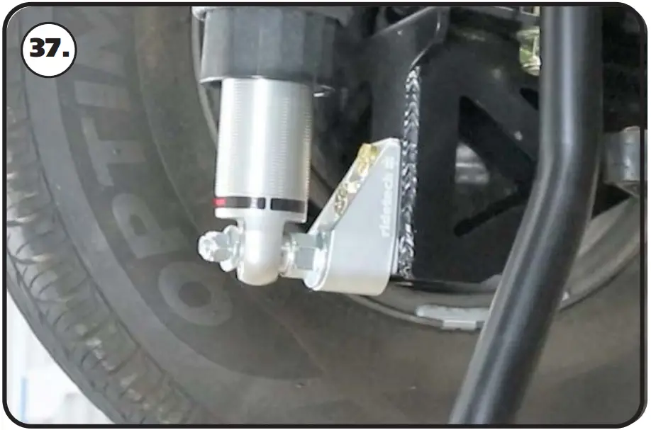 - nstall the 7/16” Flat washer and 7/16” Nylok nut. Tighten the upper and lower shock bolts. Torque the Upper Bolt to 50 ftlbs and the Lower Nut to 40 ftlbs. The designed ride height of the CoilOver/Shockwave is 14 1/2” center to center.
