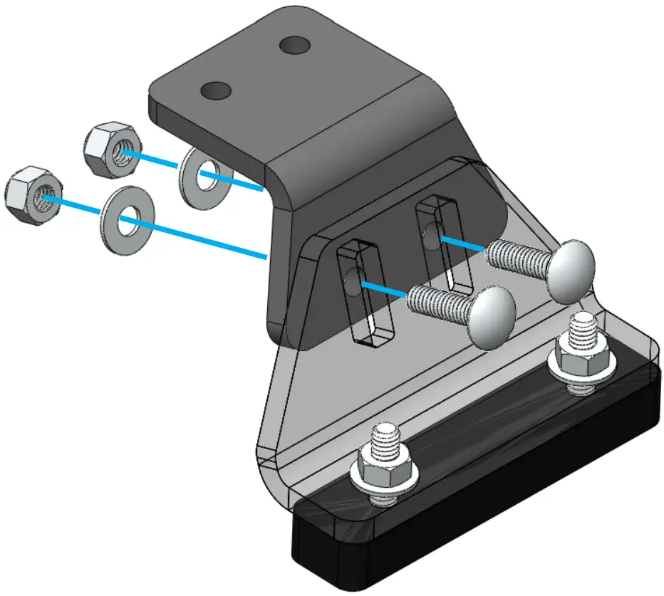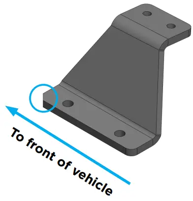 Fasten the sideplates to the ends of the two mounting-foot cross members using the supplied 1” socket buttons and flat washers in the designated mounting slots, as pictured above. Recall that the brackets come in pairs denoted by the ‘F’ (front) or ‘M’ (middle). Note the small notch in the bottom corner of the bracket – this will face toward the front of the vehicle when installed.