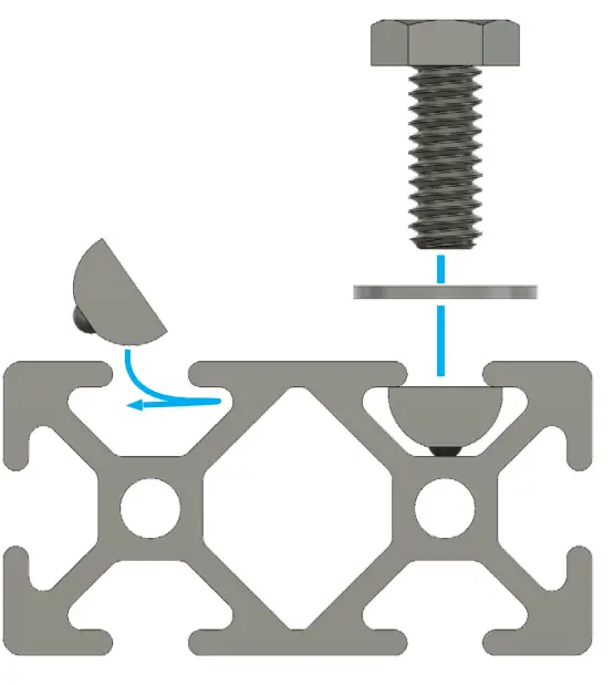 Drop 6 tnuts into the slots on the cross member and line them up with the holes in the fairing. Secure with 6 bolts and washers.