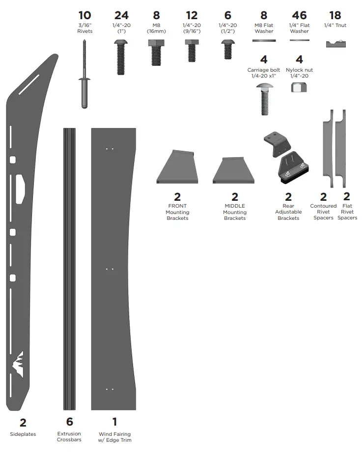 Position the wind fairing in line with the diagonal slot at the front of the rack. Align the bottom of the fairing with the tip of the roof rack and secure it using four 1” socket buttons and washers. Note that the wind fairing is NOT intended to sit on the vehicle’s roof – a small gap of 1/8” – 1/4” is ideal.