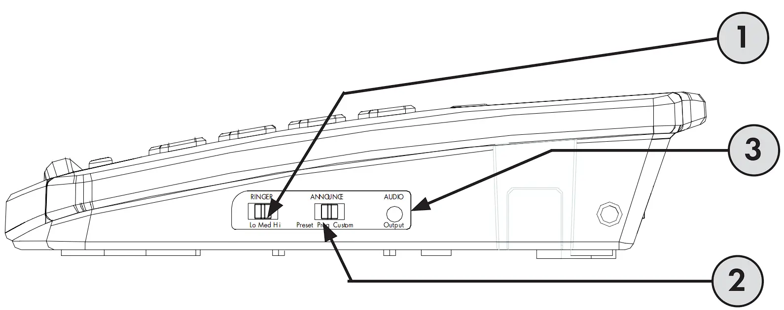 Choose between factory “Presets”, or place in “Prog” to program your own number button announcements, then engage them in the “Custom” setting.** - Audio Output Port