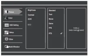Press the Power button left to switch between the preset display modes. These modes include: Standard, Text, Movie, Game, FPS and RTS. These modes are designed to optimise settings according to your activity. Standard mode is suitable for most activities.
