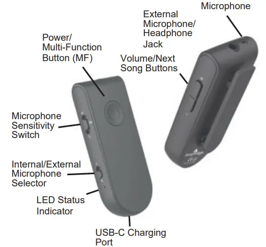 | Pairing Mode | When the device is OFF hold the “MF“ button until the blue/red LED’s begins to flash. Pair the microphone to your device. The microphone will turn off if not paired for 5 minutes |