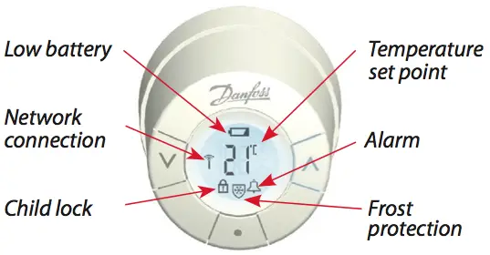 The actual temperature setpoint is shown in the LCD display and can be overwritten by using the arrow keys on the device. This overwriting is temporary and only valid until the next change of the temperature setpoint (either triggered from external wireless command or from the internal downloaded schedule) becomes active.