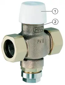 | 2 | Valve housing PN16, DN15 with 3/4″ flat sealing external threads to DIN/ISO 228. Suitable pipe connections see ‘Accessories’ | Red bronze | |