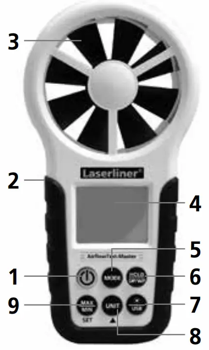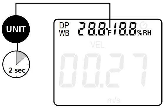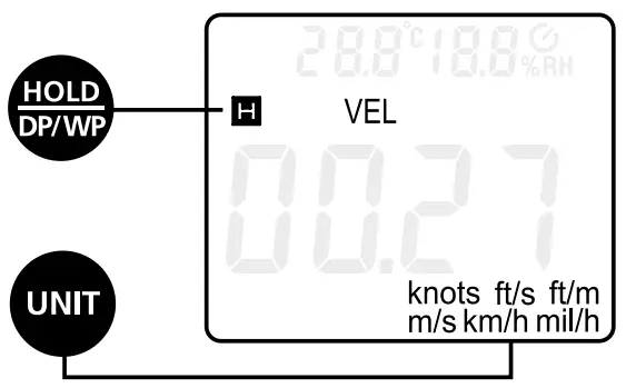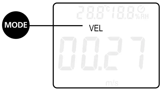 After switching on by pressing the „MODE“ button, activate the „VEL“ function. Press the „UNIT“ button repeatedly to change the units: m/s (metres per second), km/h (kilometres per hour), mil/h (miles per hour), ft/m (feet per minute), ft/s (feet per second), knots.